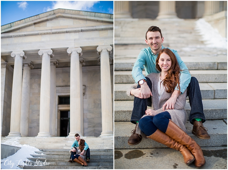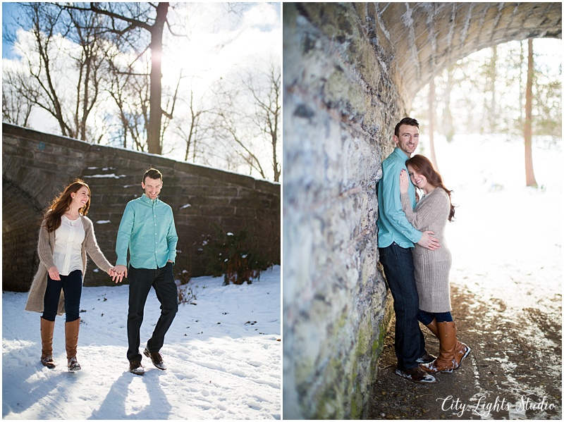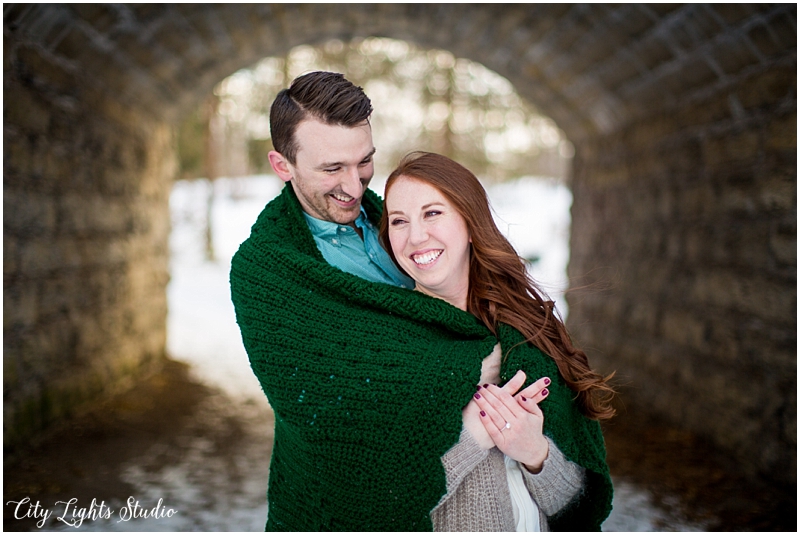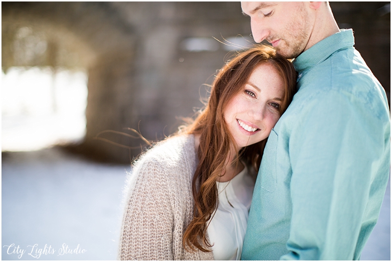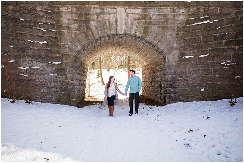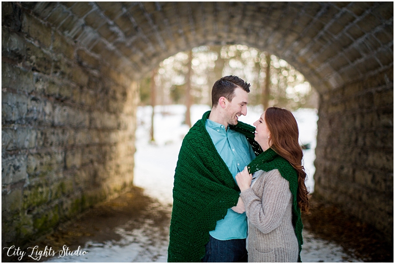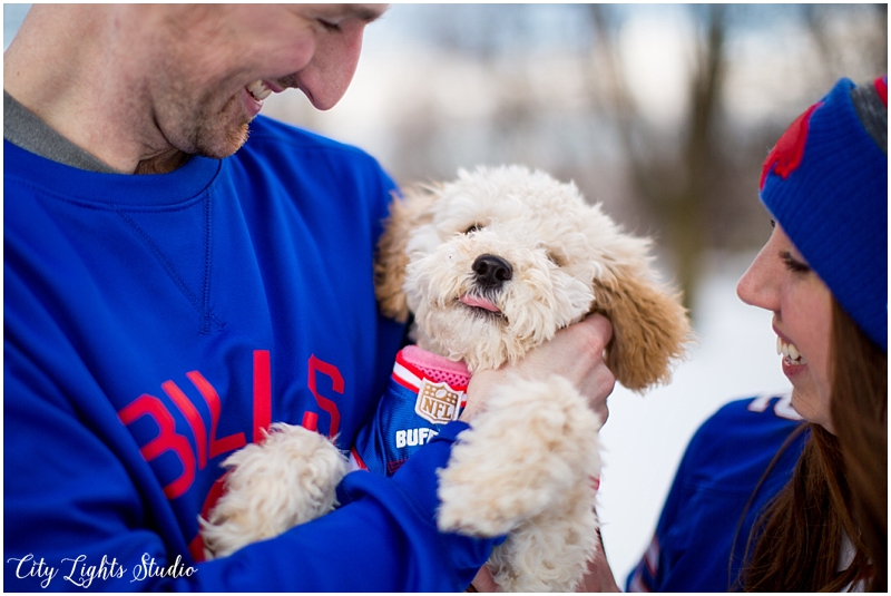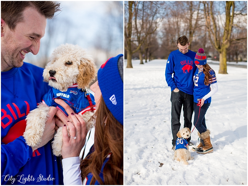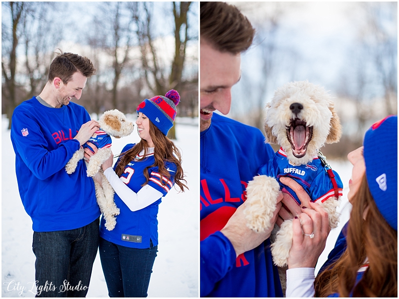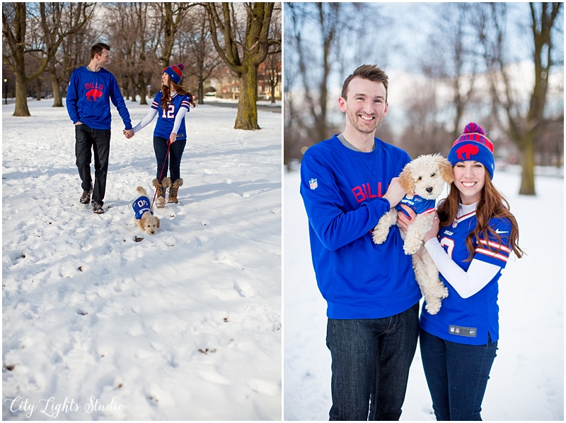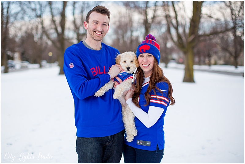 Meet Brendan & Caitlin! They are getting married on St. Patrick’s Day, which will be my own wedding anniversary! This wedding is going to a blast; I love anyone who loves St Patrick’s Day as much as I do 😉 They celebrate it everyday, with their adorable new puppy, who they aptly named Clover. She came decked out in her Bill’s gear, ready for her close-up. I loved getting to meet her, and it was so nice to spend a sunny winter afternoon with B&C at some of Buffalo’s best spots for their e-session. Check out our adventures below!