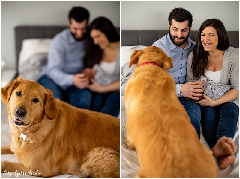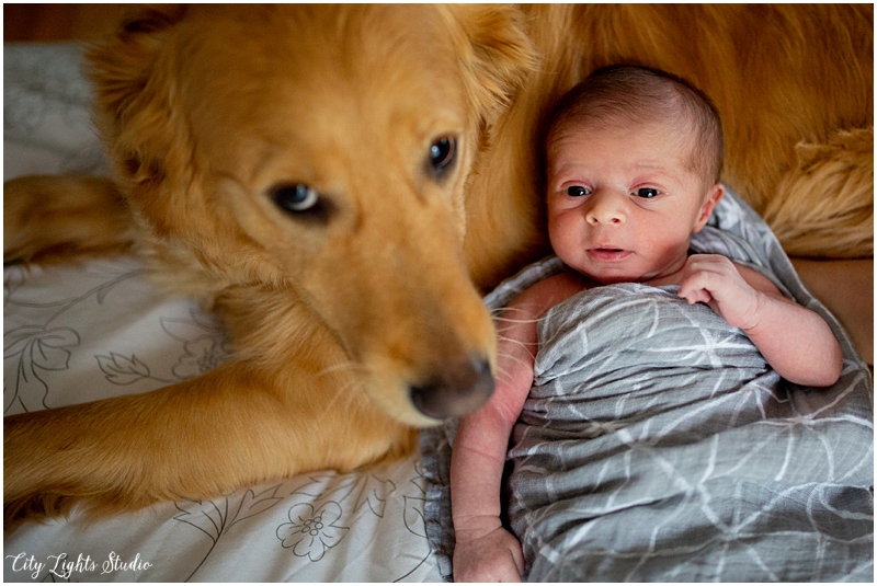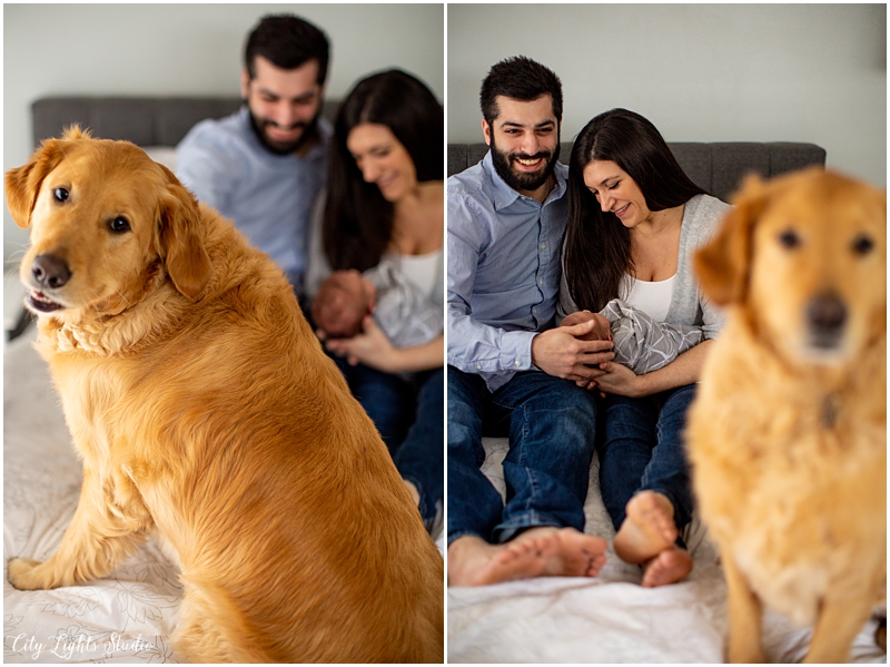 At-home, lifestyle newborn sessions are my favorite kind, and I’m excited to share a recent one with this sweet babe & his crew. These shoots are the best because the babies are happy and settled, the parents feel no stress, and the personalized backdrop of each family home allows for truly special photographs. Plus, furry friends can be included (and you better believe that Frank the golden retriever made sure he was a BIG part of this session!)