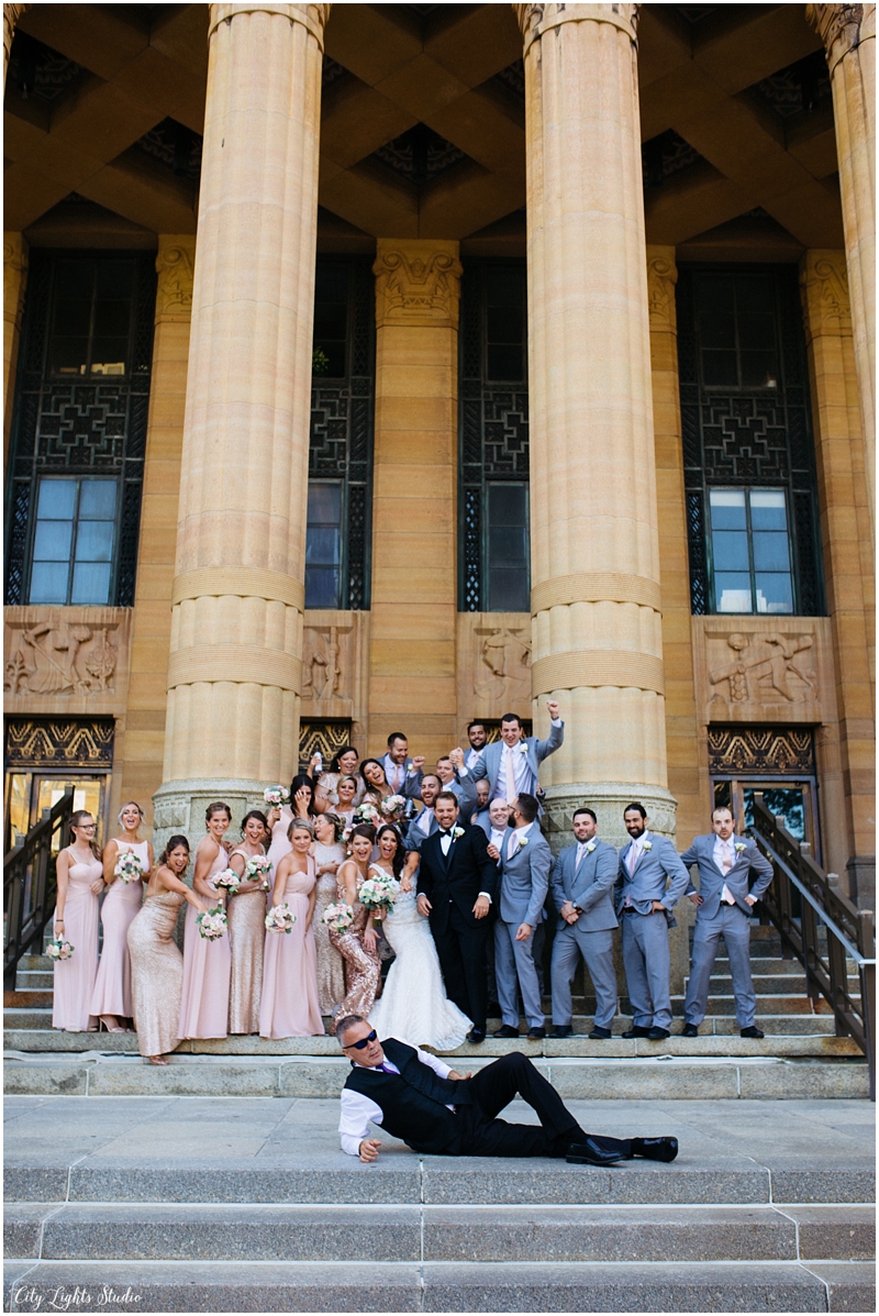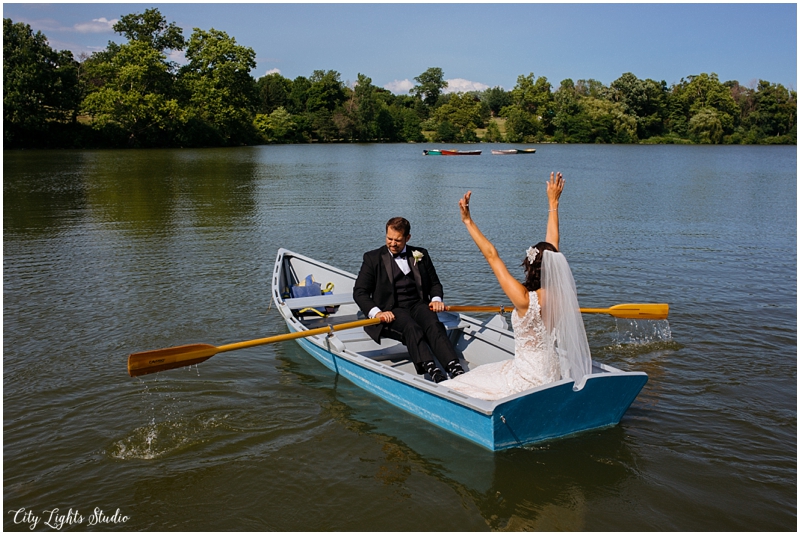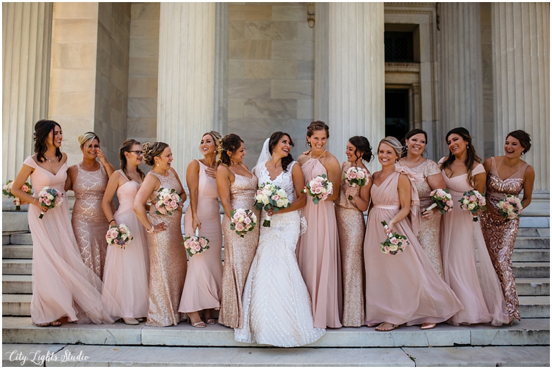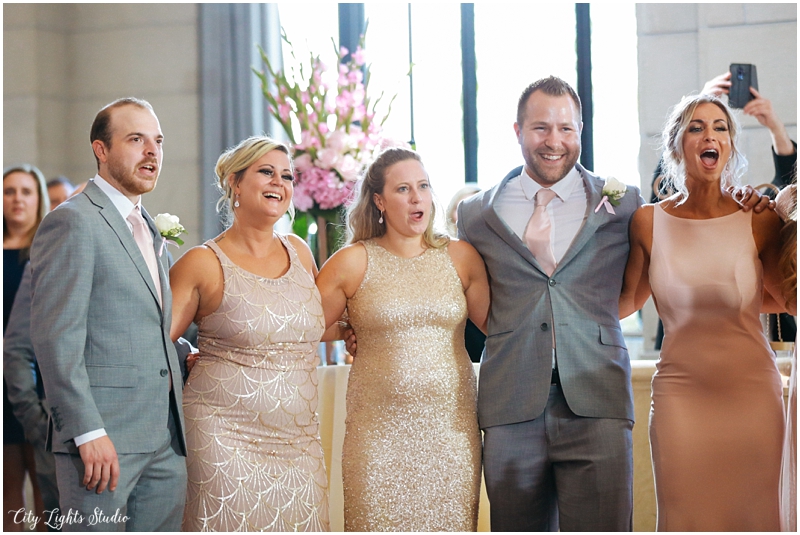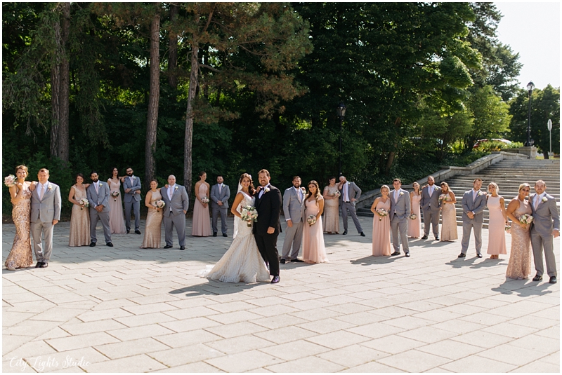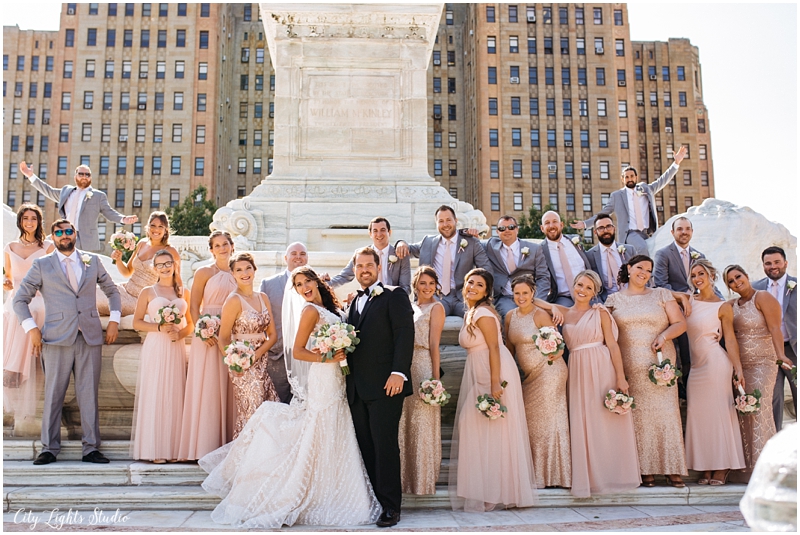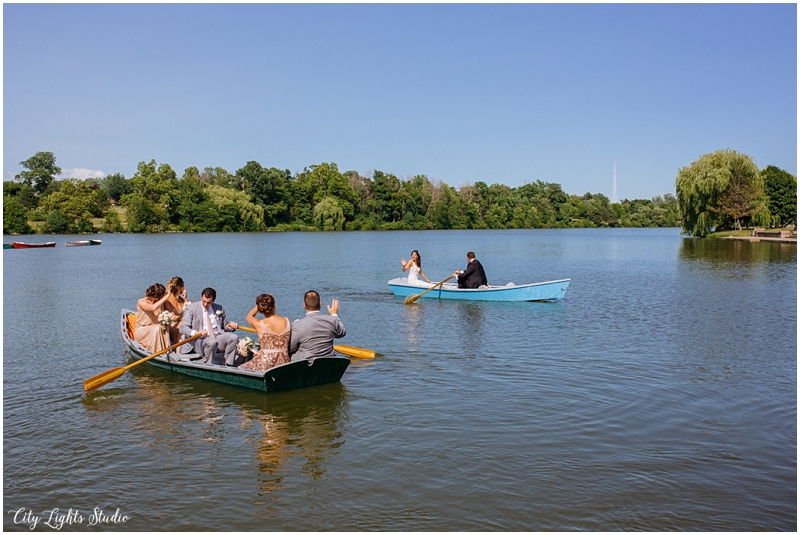 Their ceremony took place at one of our oldest and most lovely churches, St. Joseph Cathedral. This is one of the prettiest places in our city (I’ve been hundreds of times, and still see something new at each visit). Afterwards, the newlyweds & their BIG, fun bridal party headed to Delaware Park, and paddled around in boats on Hoyt Lake! There was potential for disaster, but luckily, everyone aced it 😉 We hopped over to City Hall on our way downtown, and grabbed some fun group shots (play I-spy, and find the dancing police officer…)