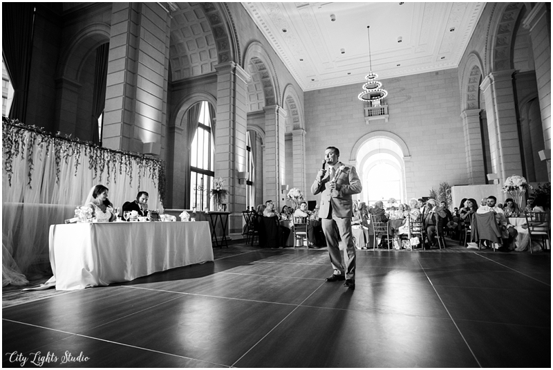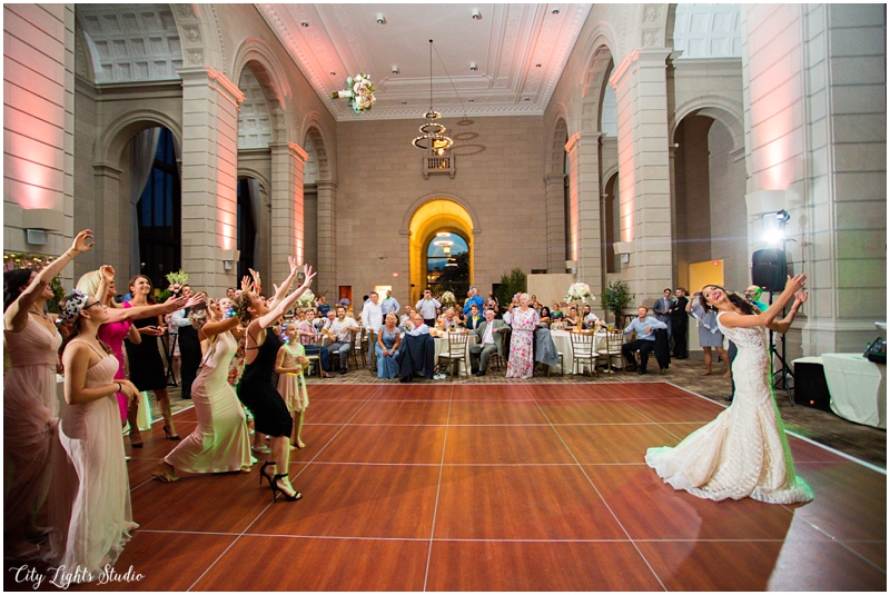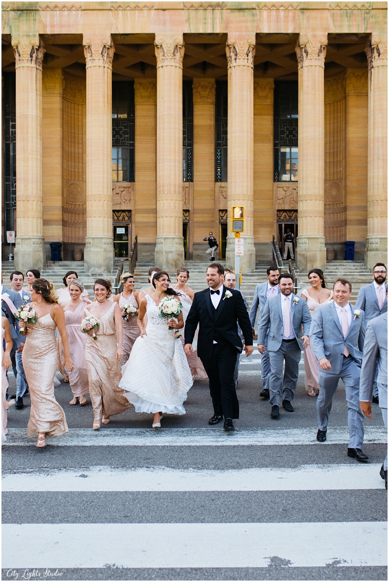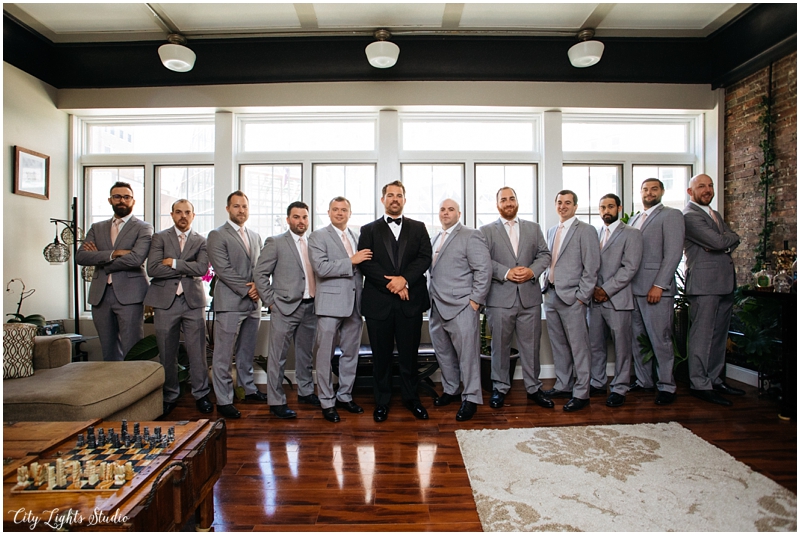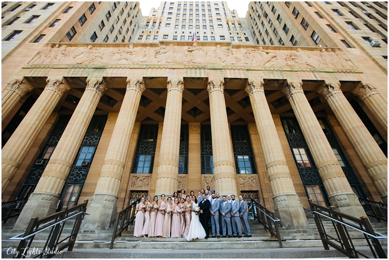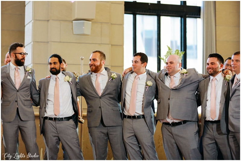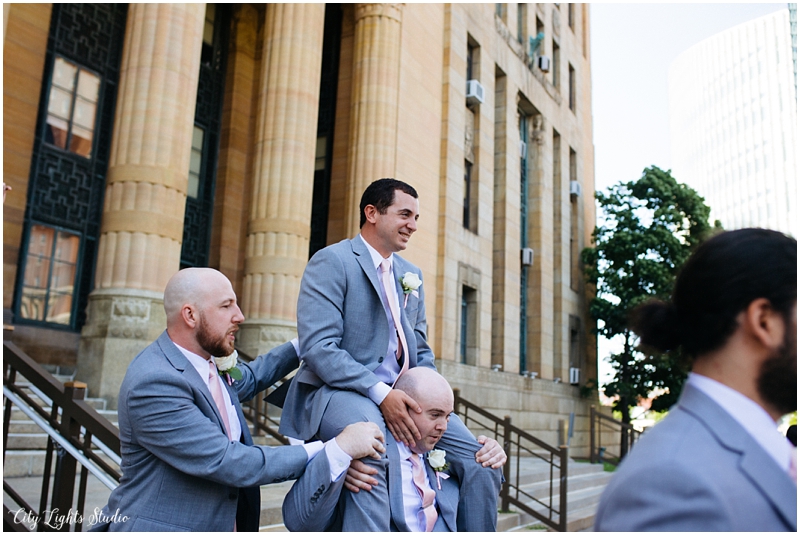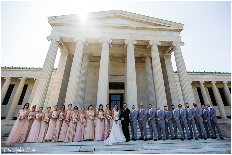 Their ceremony took place at one of our oldest and most lovely churches, St. Joseph Cathedral. This is one of the prettiest places in our city (I’ve been hundreds of times, and still see something new at each visit). Afterwards, the newlyweds & their BIG, fun bridal party headed to Delaware Park, and paddled around in boats on Hoyt Lake! There was potential for disaster, but luckily, everyone aced it 😉 We hopped over to City Hall on our way downtown, and grabbed some fun group shots (play I-spy, and find the dancing police officer…)